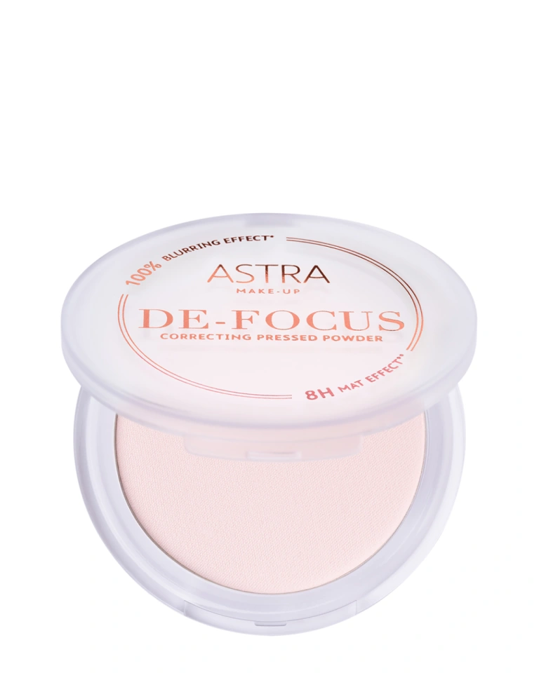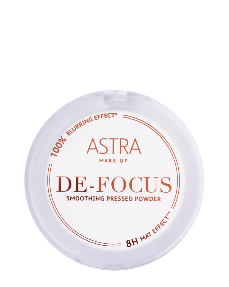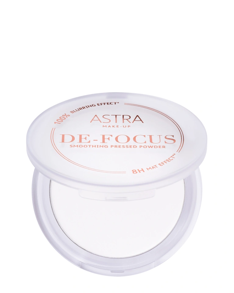Pudra compactă netezitoare Astra De-Focus Smoothing Pressed Powder creează instant un efect de soft-focus, îmbunătățind vizual textura pielii și uniformitatea tenului. Textura sa ultraușoară estompează porii, conferă pielii un aspect neted, elimină excesul de sebum și fixează machiajul, oferind un efect de blurare 100% („soft-focus effect”) și un finisaj mat de până la 8 ore.
