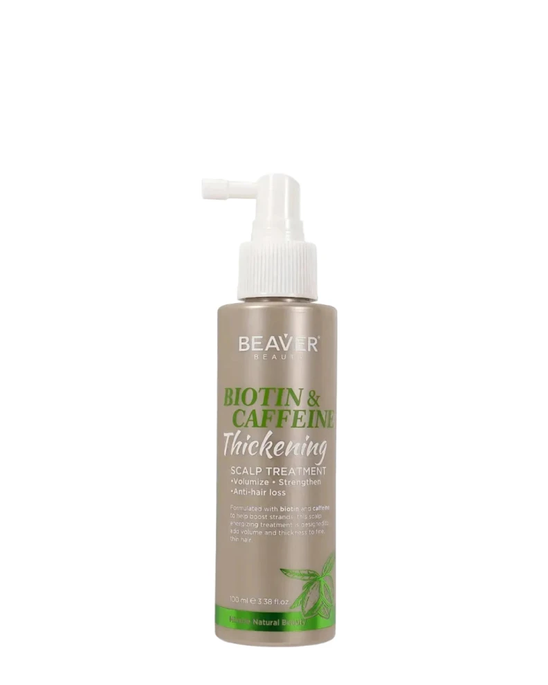 Spray-ul hipoalergenic împotriva căderii părului BEAVER Biotin & Caffeine Thickening Scalp Treatment pe bază de biotină și cafeină, a fost creat special pentru a preveni căderea părului și a stimula creșterea acestuia. Conține un complex unic de ingrediente active care contribuie la întărirea eficientă a părului și la menținerea sănătății acestuia. Spray-ul tonifică, răcorește plăcut, crește elasticitatea părului, reducând căderea și fragilitatea, stimulează creșterea părului și întărește rădăcinile. Formula combină componente, care stimulează creșterea, precum și ingrediente care hidratează și calmează scalpul. Are un efect delicat încălzitor asupra scalpului, un efect antiseptic și antibacterian, intensifică microcirculația, reduce iritația pielii, ameliorează simptomele și menține sănătatea scalpului în cazul predispoziției la probleme dermatologice.