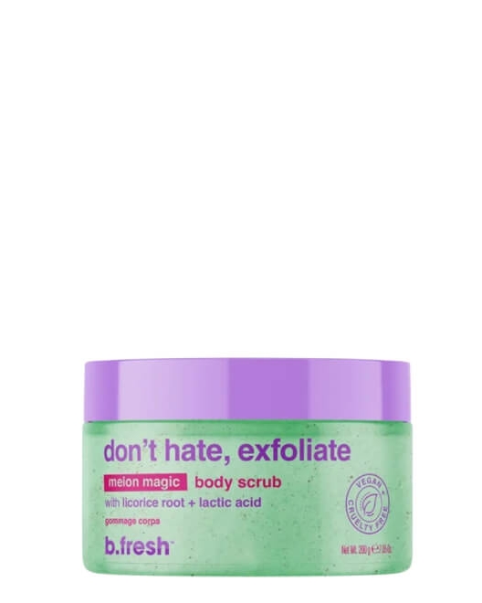 b.fresh Don't Hate, Exfoliate Body Scrub cu aromă de pepene galben pe bază de acid lactic curăță eficient pielea de celulele moarte ale pielii și o exfoliază, oferindu-i netezime și strălucire naturală. Componentele active ale scrub-ului au un efect antiinflamator, antibacterian și calmant. Produsul hidratează pielea, stimulează sinteza acidului hialuronic și a ceramidelor în piele, începe procesele de regenerare și restaurare, îmbunătățește tonusul și textura pielii. Scrub-ul elimină uscăciunea, catifelează și netezește, elimină culoarea ternă a pielii. Formulă vegană. Nu este testat pe animale. Fără parabeni, sulfați și săruri de aluminiu.