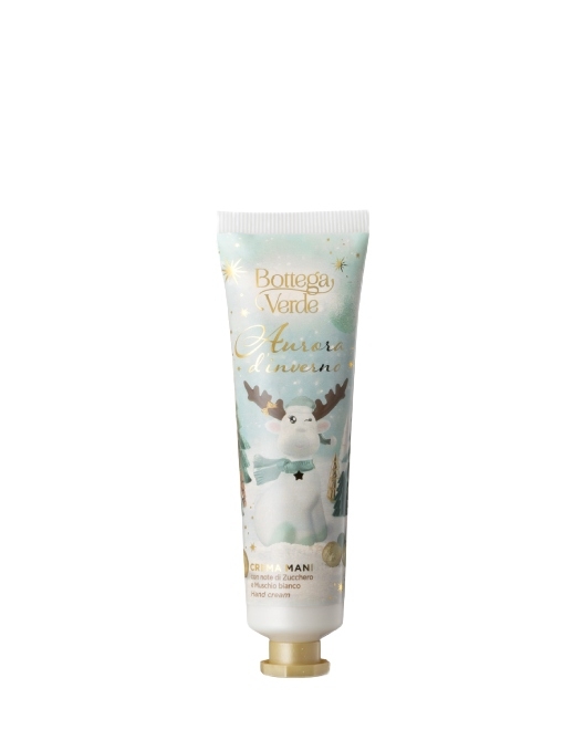 Crema de mâini parfumată Bottega Verde Aurora D’inverno Hand Cream cu note dulci de zahăr și mosc alb.