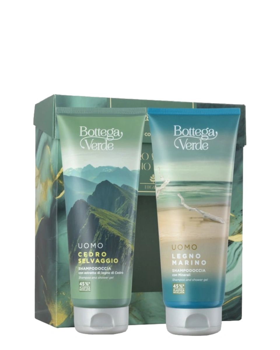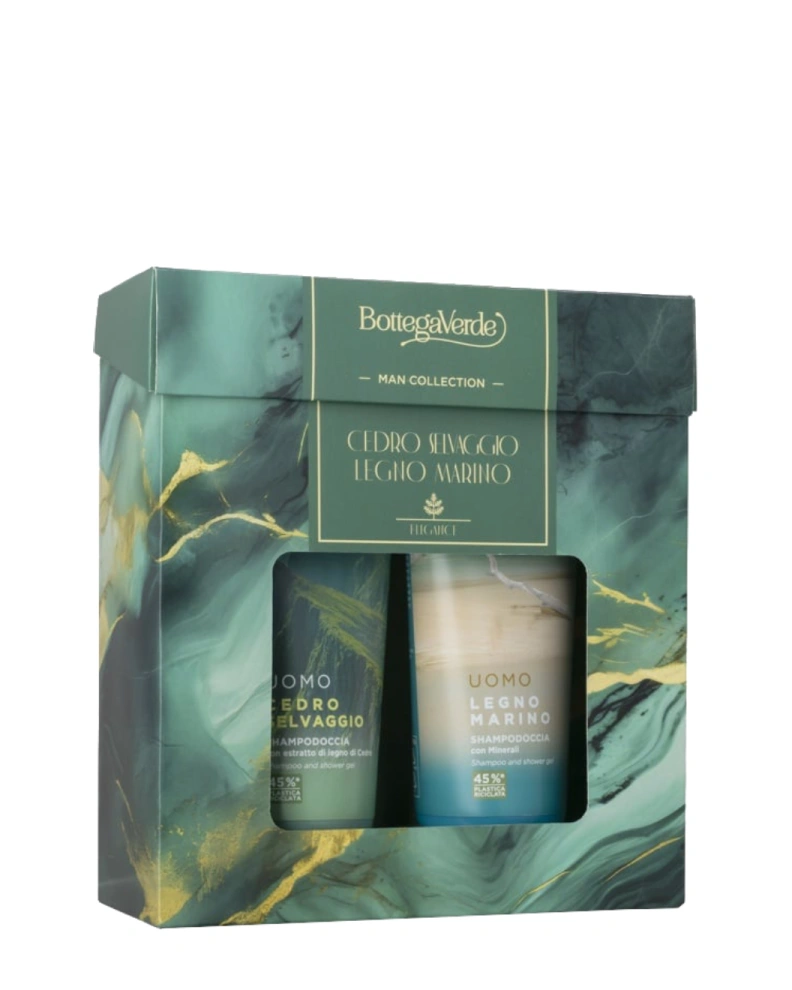 Setul cadou pentru îngrijirea corpului Bottega Verde Legno Marino e Cedro Selvaggio Bath Kit pentru bărbați include două produse parfumate: