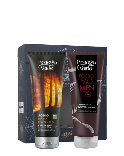Setul pentru bărbați Bottega Verde Man Freedom Spirit Rosso Nero Bath Gift în ambalaj cadou include două produse parfumate multifuncționale: