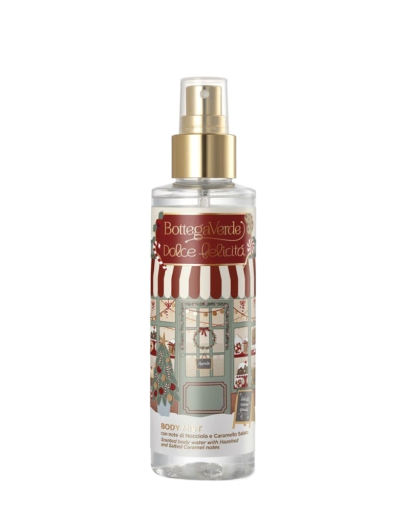 Spray-ul parfumat de corp și păr Bottega Verde Dolce Felicita Body Mist are o rezistență bună pe parcursul zilei, hidratează pielea și îi conferă un parfum delicat, cu note dulci de alune și caramel sărat.