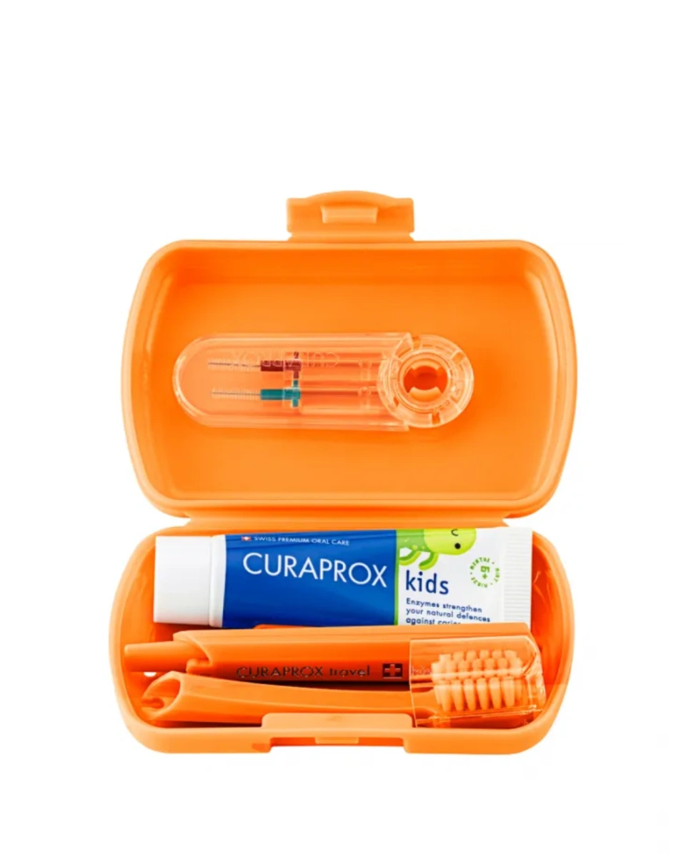 Setul de călătorie pentru copii CURAPROX Kids Travel Set Orange va face zâmbetul copilului dumneavoastră să strălucească oriunde. Acest set universal, destinat copiilor cu vârste cuprinse între 6 și 12 ani, este ideal pentru vacanțele în familie, excursiile școlare, petrecerile în pijamale la prieteni și utilizarea zilnică după școală, asigurând o curățenie 100% a dinților în timpul călătoriilor.