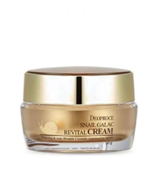 Crema pentru față cu mucină de melc Deoproce Snail Galac Revital Cream are efect anti-îmbătrânire și reînnoire, stimulează întinerirea și regenerarea celulară, hidratează în profunzime pielea, îmbunătățește elasticitatea, netezește liniile de expresie, îmbunătățește textura pielii și semnele de oboseală și stres. Crema conține trei ingrediente cheie anti-îmbătrânire puternice: filtrat de melc, filtrat de drojdie fermentată și volufilin.