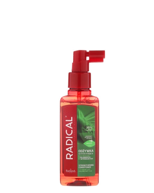 Balsamul pentru creșterea părului, care nu necesită clătire Farmona Radical Strengthening Hair Conditioner pentru părul slăbit, deteriorat, rar și predispus la cădere stimulează intens foliculii de păr, oprind căderea părului și activând creșterea sănătoasă a părului. Produsul hidratează și hrănește rădăcinile părului și scalpul, calmează, oferă densitate părului, stimulând foliculii „latenți”. Balsamul oferă părului sănătate, strălucire și netezime, reduce fragilitatea, crește elasticitatea, reface părul deteriorat, întărește și îngroașă părul. Dozatorul de pe flacon face ca utilizarea produsului să fie cât mai comodă și asigură distribuția uniformă a produsului.