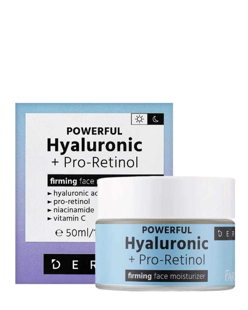 Crema intensiv fortifiantă pentru față Dermiss Powerful Hyaluronic and Pro-Retinol Firming Face Moisturizer cu pro-retinol și acid hialuronic hidratează și întărește pielea. Crema este potrivită pentru toate tipurile de piele, dar este recomandată în special pentru pielea matură sau pentru pielea cu primele semne de îmbătrânire, cu pierderea tonusului și elasticității, cu deshidratare. Crema îmbunătățește culoarea tenului, eliminând nuanța ternă și cenușie, netezește, hidratează, crește elasticitatea și suplețea, contribuie la rejuvenare și încetinește apariția ridurilor. Produsul conferă strălucire pielii și declanșează procesele de regenerare.