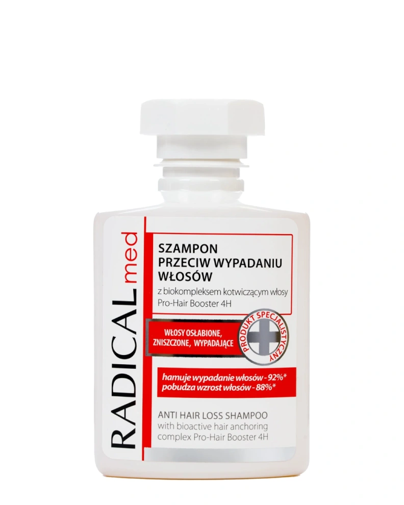 Șamponul împotriva căderii părului Farmona Radical Med Anti‑Hair Loss Shampoo este destinat curățării părului slăbit și predispus la cădere. Produsul oferă o acțiune pe mai multe niveluri: curățarea delicată a părului și a scalpului, fortificarea rădăcinilor, reducerea căderii, hrănirea firului de păr și îmbunătățirea stării generale a părului și a scalpului. Oferă o acțiune preventivă împotriva căderii, stimulează creșterea, conferă strălucire și catifelare, facilitând totodată pieptănarea.