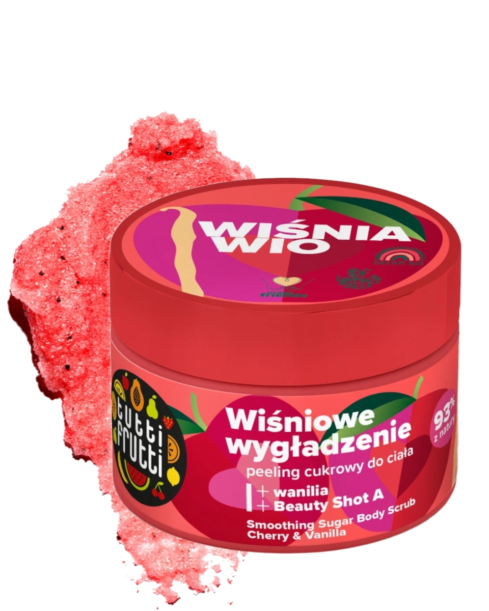 Scrubul de corp pe bază de zahăr Tutti Frutti Smoothing Sugar Body Scrub Cherry and Vanilla, cu aromă de cireșe și vanilie, exfoliază delicat stratul de celule keratinizate, face pielea netedă și catifelează. Produsul hidratează, hrănește pielea, îmbunătățește elasticitatea. Ingredientele active ajută la eliminarea iritațiilor și la refacerea pielii, la începerea proceselor de regenerare, la uniformizarea nuanței pielii și la menținerea unei bariere lipidice protectoare.
