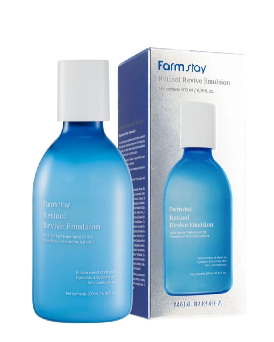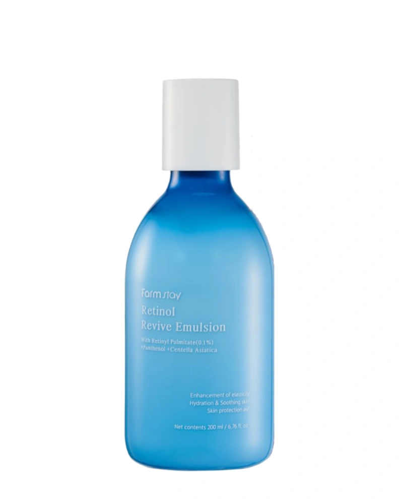 Emulsia rejuvenantă pentru față FarmStay Retinol Revive Emulsion, pe bază de două forme de retinol, are efect nutritiv, hidratant și calmant. Emulsia crește eficient elasticitatea și densitatea pielii, întărește conturul feței și are efect antiinflamator împotriva erupțiilor cutanate. Netezește ridurile fine, reduce adâncimea ridurilor profunde și îmbunătățește tenul. Produsul iluminează pigmentarea, reglează sebumul, reduce porii și conferă pielii un aspect natural strălucitor. Are o textură cremoasă ușoară, fără a fi lipicioasă.