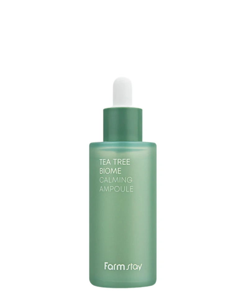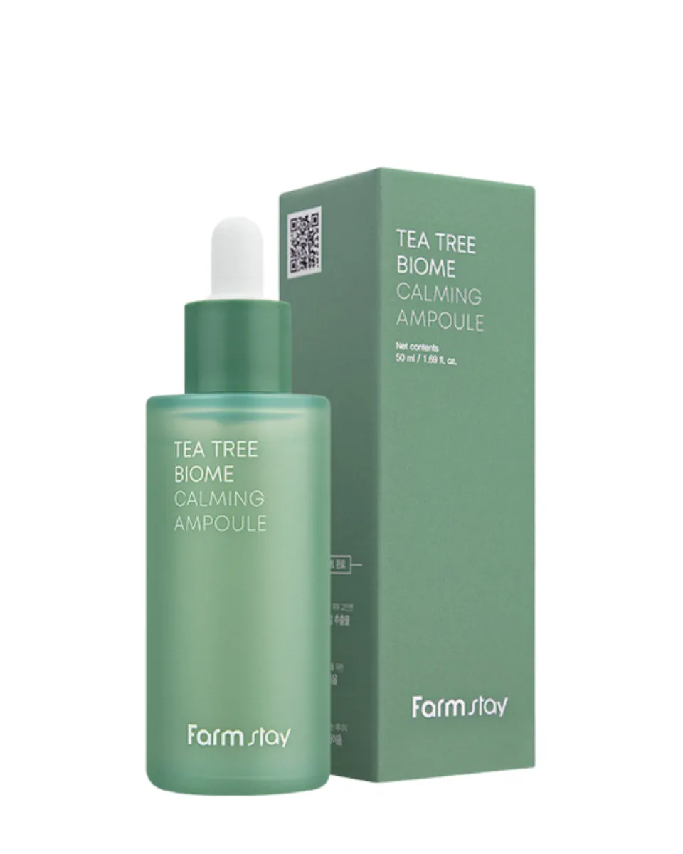 Serul-ampulă calmant FarmStay Tea Tree Biome Calming Ampoule pe bază de extract de arbore de ceai, are un efect antibacterian și antiinflamator pronunțat. Serul, pe bază de ingrediente active în concentrație ridicată, are acțiune cicatrizantă și calmantă, ameliorează mâncărimea, iritațiile și roșeața. Reglează funcționarea glandelor sebacee, reduce grăsimea pielii pe parcursul zilei și hidratează. Produsul are proprietăți regenerante și dezinfectante, crește elasticitatea și fermitatea pielii și hidratează.