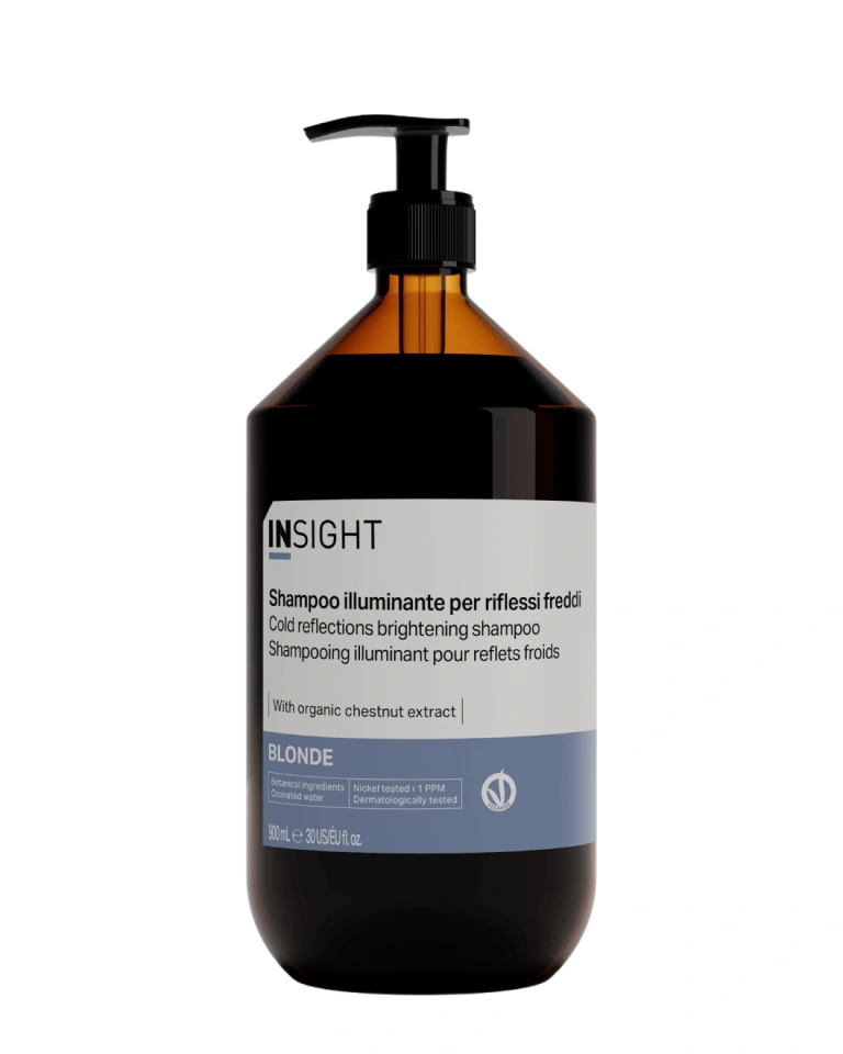 Șamponul pentru menținerea nuanței reci a părului blond Insight Blonde Cold Reflections Brightening Shampoo este formulat pentru a menține tonurile reci ale părului decolorat anterior sau cu melaj prin neutralizarea pigmenților galben-portocalii. Produsul curăță delicat scalpul și părul de impurități, în timp ce hidratează intens, hrănește părul, îi reface structura, dă strălucire, catifelare și netezime, crește elasticitatea părului, reducând fragilitatea.