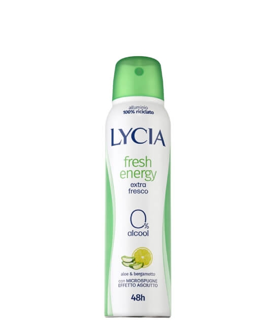 Spray-ul-deodorant Lycia Fresh Energy 48h Deo Spray nu conține alcool, nu usucă pielea, nu provoacă iritații și oferă protecție de durată împotriva mirosului de transpirație timp de 48 de ore. Formula sa, bazată pe o componentă antibacteriană naturală selectivă, este capabilă să contracareze bacteriile care provoacă miros neplăcut, fără a perturba microbiomul pielii. Produsul are un efect hidratant și calmant și o aromă răcoritoare de aloe și bergamotă. Nu conține alcool sau coloranți, ceea ce îi permite să fie folosit după depilare. Testat dermatologic.