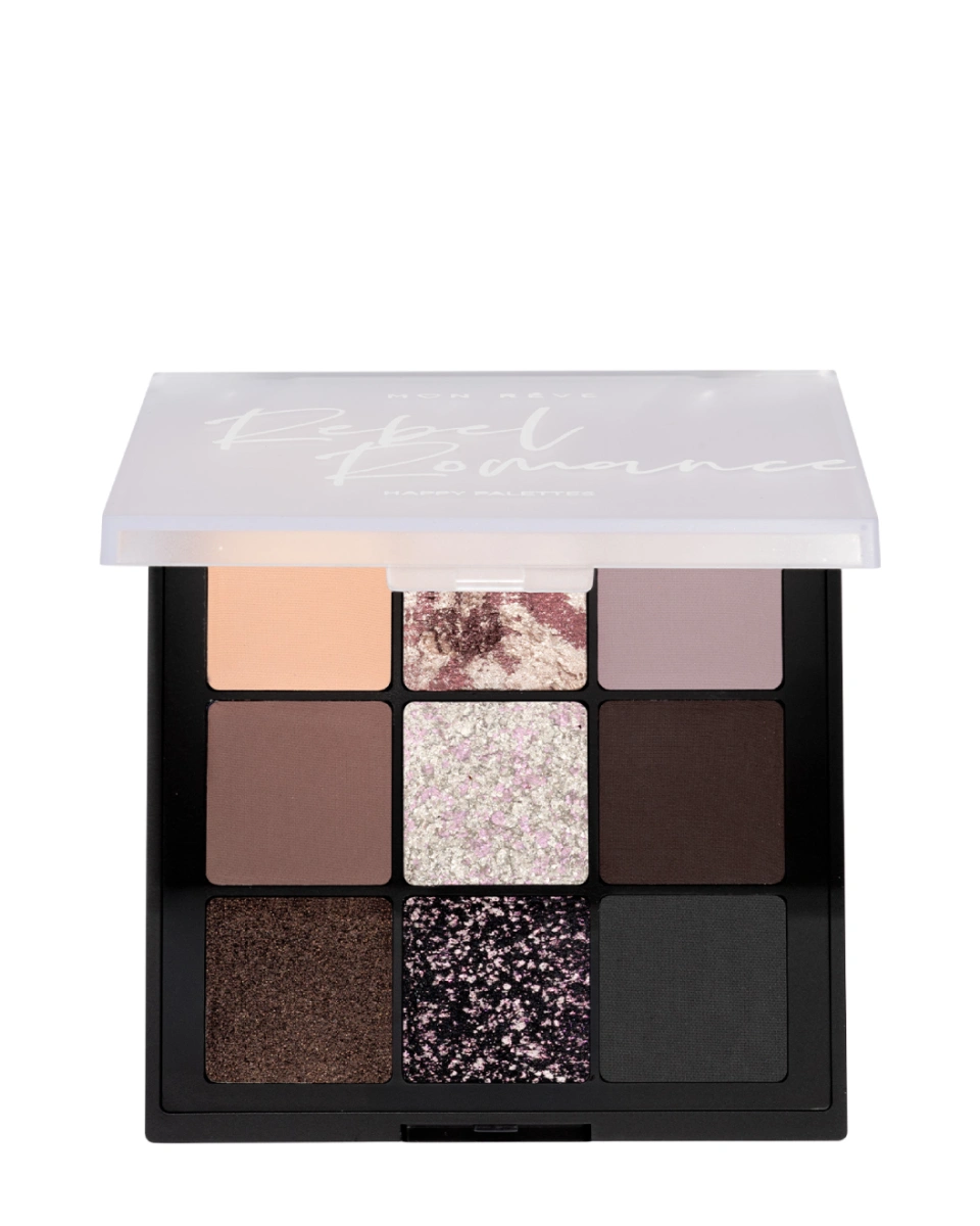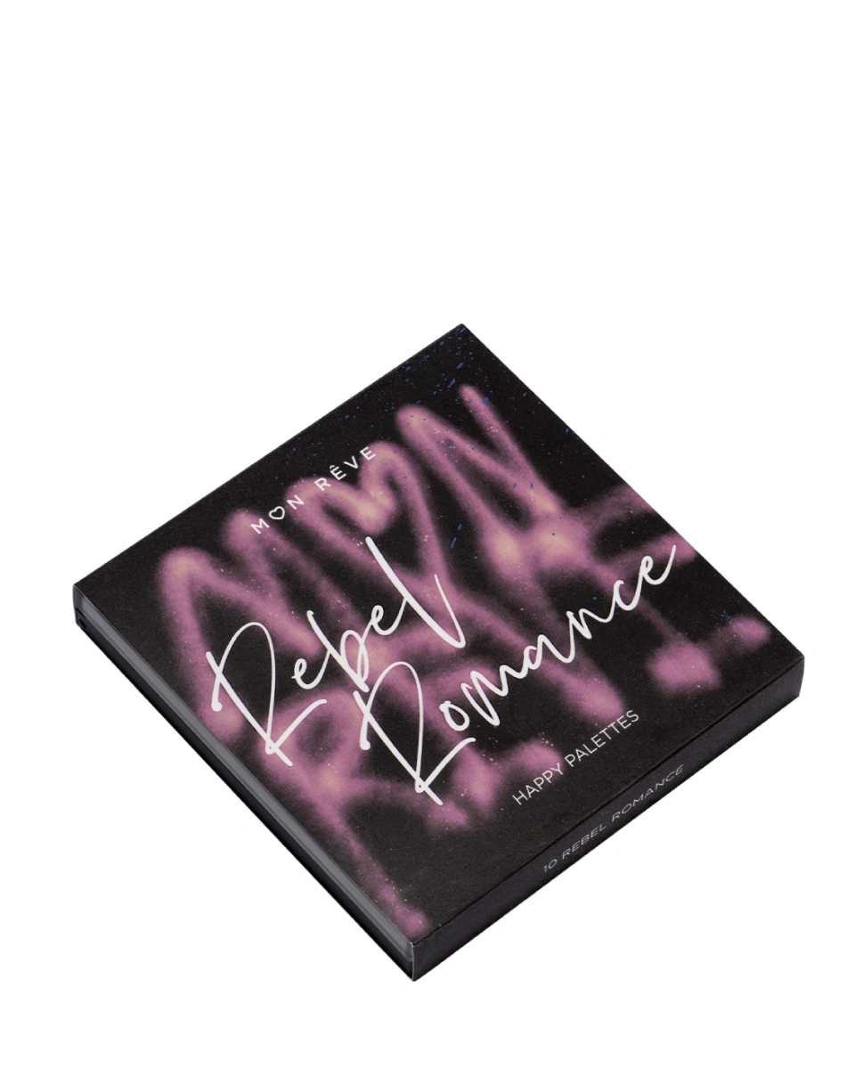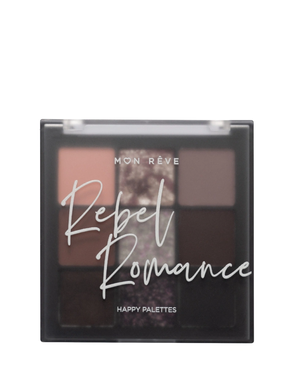 Paleta de farduri de pleoape rezistente MON REVE Rebel Romance Happy Palettes Eye Shadow include 9 nuanțe foarte pigmentate cu textură satinată și mată. Fardurile se combină bine între ele, se aplică și se estompează ușor, permițând stratificarea produsului pentru a obține intensitatea dorită.