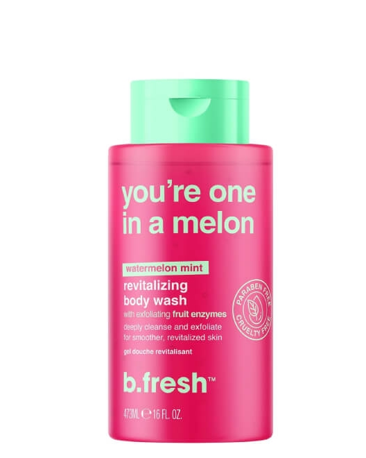 Обновляющий гель для душа b.fresh You're One In A Melon Revitalizing Body Wash на основе ягодных и фруктовых кислот деликатно и эффективно очищает кожу, наполняет кожу ароматом арбуза и мяты, освежает, не вызывает раздражения или ощущения стянутости и сухости. Благодаря активным компонентам, гель увлажняет кожу, стимулирует процессы обновления и регенерации, повышает упругость и эластичность, укрепляет, успокаивает, интенсивно увлажняет.