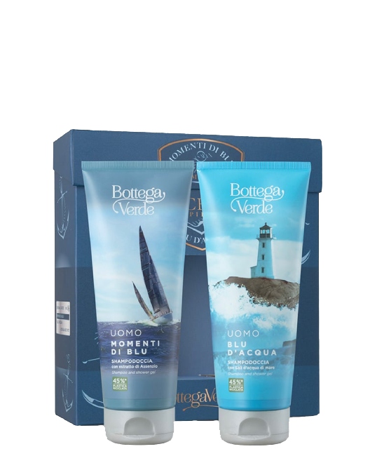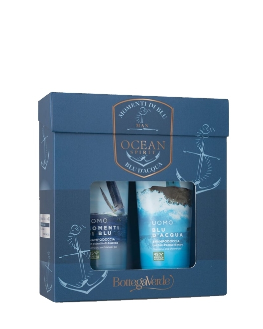Набор для мужчин Bottega Verde Man Ocean Spirit Blu Bath Gift в подарочной упаковке включает два многофункциональных парфюмированных продукта: