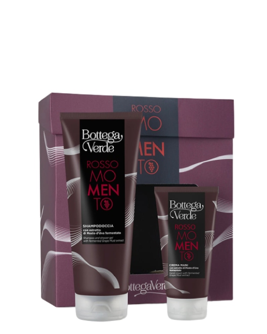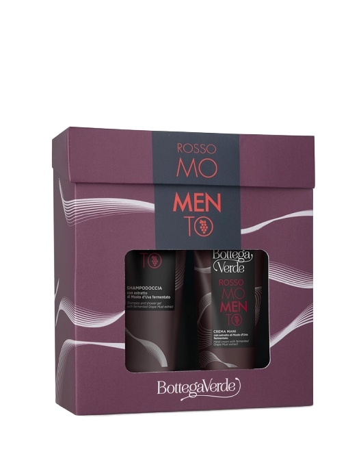 В набор для мужчин Bottega Verde Man Rosso Momento Gift Set в подарочной упаковке входит увлажняющий шампунь/гель для тела 2 в 1 Bottega Verde Man Rosso Momento Shampoo and Body Gel 200 мл и увлажняющий крем для рук Bottega Verde Man Rosso Momento Hand Cream 75 мл. Оба продукта созданы на основе ферментированного экстракта виноградного сусла, которое оказывает антиоксидантный, увлажняющий и омолаживающий эффект, выравнивает тон кожи и омолаживает. Продукты обладают свежим ароматом.