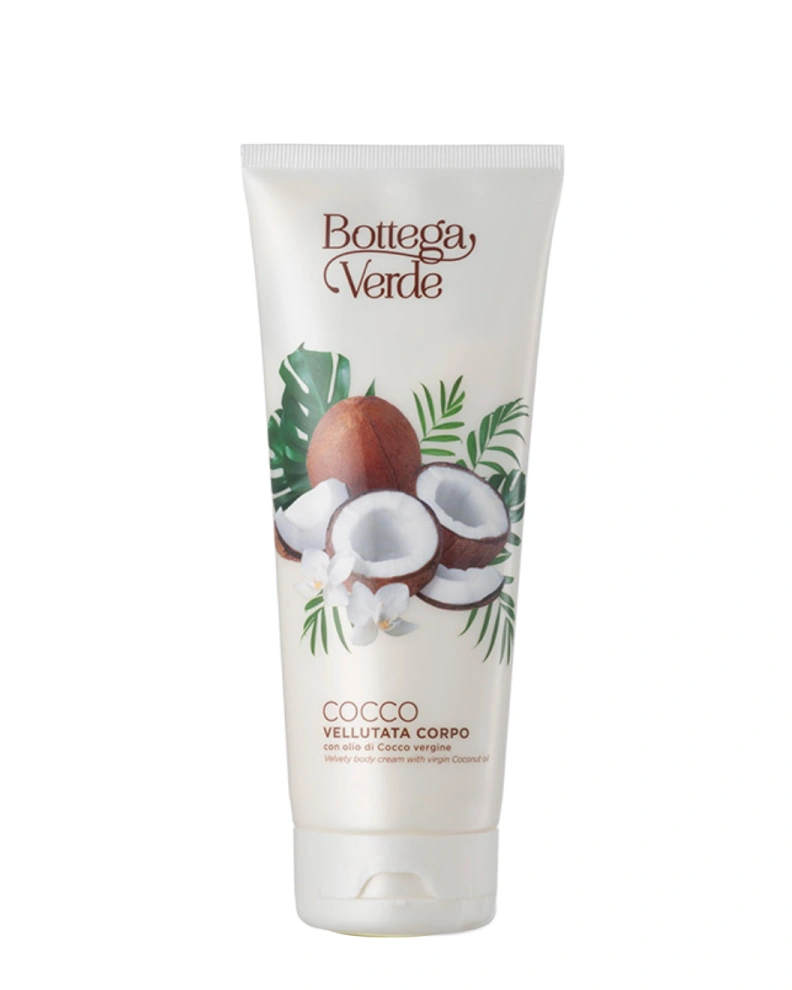 Питательный крем для тела Bottega Verde Cocco Velvety Body Cream with Virgin Coconut Oil на основе кокосового масла интенсивно ухаживает за кожей, устраняет сухость, шелушения и ощущения стянутости, покраснения и раздражение, питает и увлажняет. Крем оказывает восстанавливающий и регенерирующий эффект, смягчает и разглаживает кожу, успокаивает, повышает упругость и эластичность, придает гладкость.