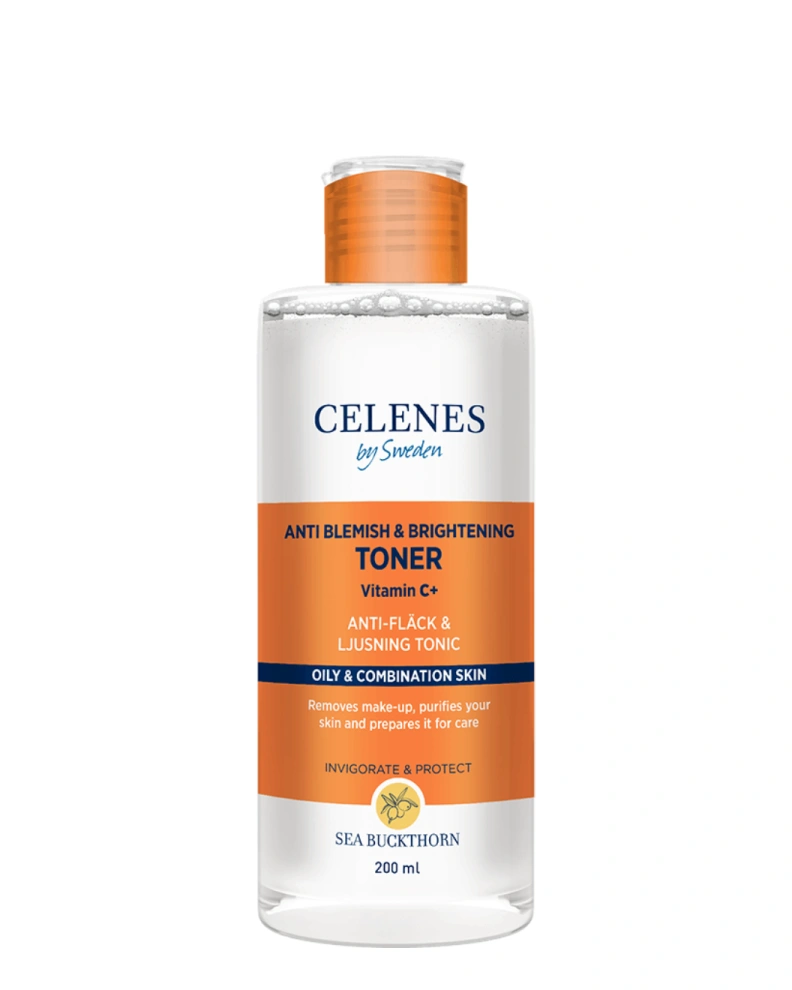 Осветляющий тонер CELENES by Sweden Sea Buckthorn Anti Blemish & Brightening Toner Vitamin C+ на основе облепихи оказывает себорегулирующее, противовоспалительное и успокаивающее действие, мягко осветляет пигментацию и постакне, предупреждая появление новых пятен. Тонер помогает осветлить чёрные точки и сальные нити, предотвращает воспаления и появление закрытых комедонов. Активные компоненты средства эффективно успокаивают, устраняют покраснения и раздражение, смягчают кожу, выравнивают тон, рельеф и устраняют тусклый цвет лица, придавая естественное сияние. Продукт обновляет кожные покровы, увлажняет, оказывает антиоксидантный эффект, ускоряет заживление и регенерацию.