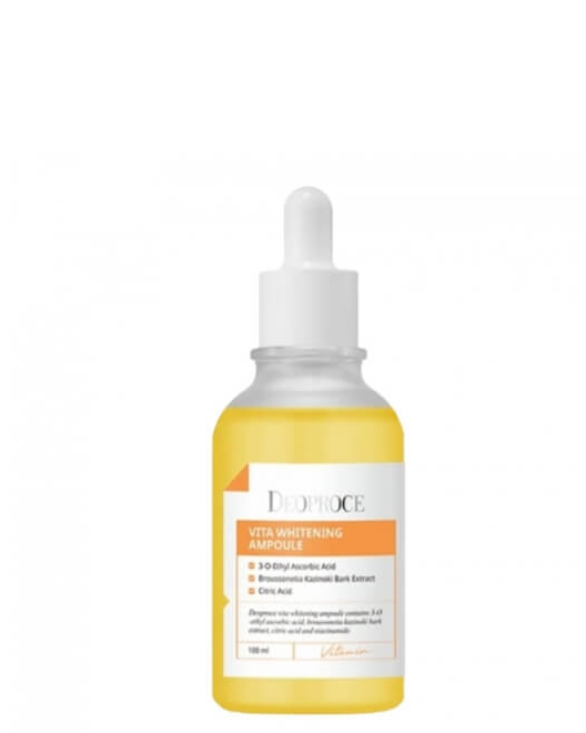 Осветляющая ампульная сыворотка для лица Deoproce Vita Whitening Ampoule с высококонцентрированной формулой на основе витамина С оказывает мощный антиоксидантный, омолаживающий и осветляющий эффект. Сыворотка эффективно тонизирует кожу, укрепляет и оздоравливает, замедляет процессы старения, осветляет пигментацию и постакне. Средство снижает уровень воспалений, устраняет раздражение, увлажняет и питает. Укрепляет мелкие капилляры. Высокая концентрация активных ингредиентов помогает придать яркий, здоровый цвет лица и устранить тусклость, выравнять микрорельеф, разгладить и смягчить. Продукт имеет легкую текстуру, которая быстро впитывается и не оставляет ощущения липкости или жирности.