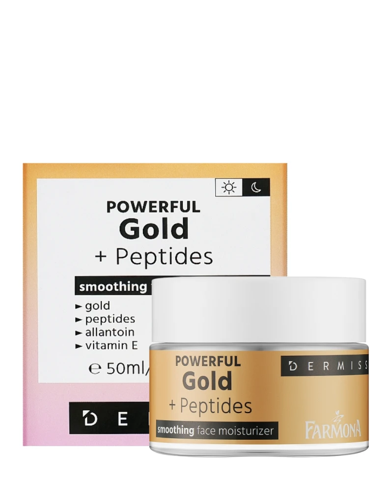 Омолаживающий крем для лица Dermiss Powerful Gold and Peptides Smoothing Face Moisturizer с золотом и пептидами обладает разглаживающим и увлажняющим действием. Крем повышает упругость и эластичность кожи, оказывает омолаживающий эффект, питает и увлажняет, устраняет сухость и дряблость, придает сияние коже и гладкость. Уменьшает выраженность мелких морщин и глубину крупных заломов, успокаивает, оказывает антиоксидантный эффект, предупреждая старение кожи.