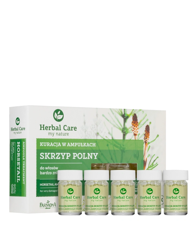 Укрепляющие лечебные ампулы для волос Farmona Herbal Care Horsetail Ampoule Treatment – высококонцентрированное средство, специально созданное для поврежденных и ослабленных волос. Формула основана на природных растительных ингредиентах, которые укрепляют волосяные фолликулы, пробуждают «спящие» фолликулы, укрепляют волосы, улучшают питание, снижают ломкость и стимулируют рост здоровых волос.