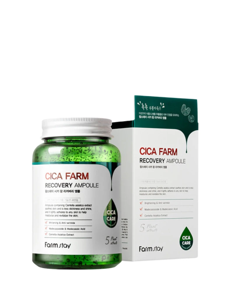 Успокаивающая ампульная сыворотка FarmStay Cica Farm Recovery Ampoule на основе высокого содержания экстракта центеллы устраняет раздражения и покраснения на коже, снимает зуд, оказывает противовоспалительный эффект и способствует заживлению и сокращению воспалений. Сыворотка снижает реактивность кожи, выравнивает тон, стимулирует синтез коллагена и процессы регенерации, увлажняет, тонизирует и освежает.