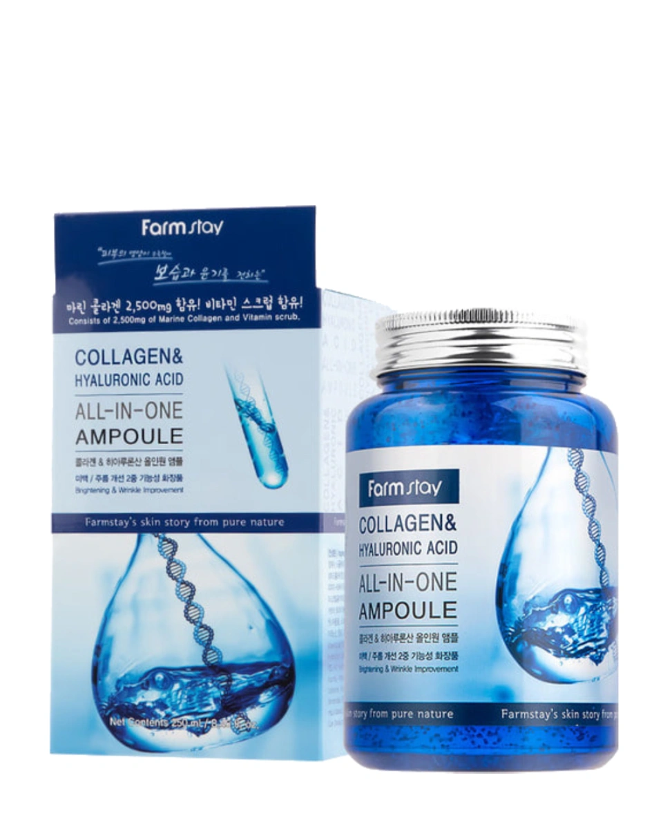 Ампульная увлажняющая сыворотка FarmStay Collagen & Hyaluronic Acid All-in-one Ampoule с высокой концентрацией ингредиентом на основе коллагена и гиалуроновой кислоты оказывает мощное увлажняющее и влагоудерживающее действие. Сыворотка замедляет процессы старения, регенерирует и восстанавливает сухую и обезвоженную кожу, устраняет покраснения и раздражение. Обеспечивает эффект длительного увлажнения кожи, смягчает, придает гладкость и естественное сияние, устраняет тусклость, разглаживает мелкие морщинки, освежает, повышает упругость, плотность кожи, омолаживает и замедляет проявление возрастных изменений, оказывает антиоксидантный эффект.
