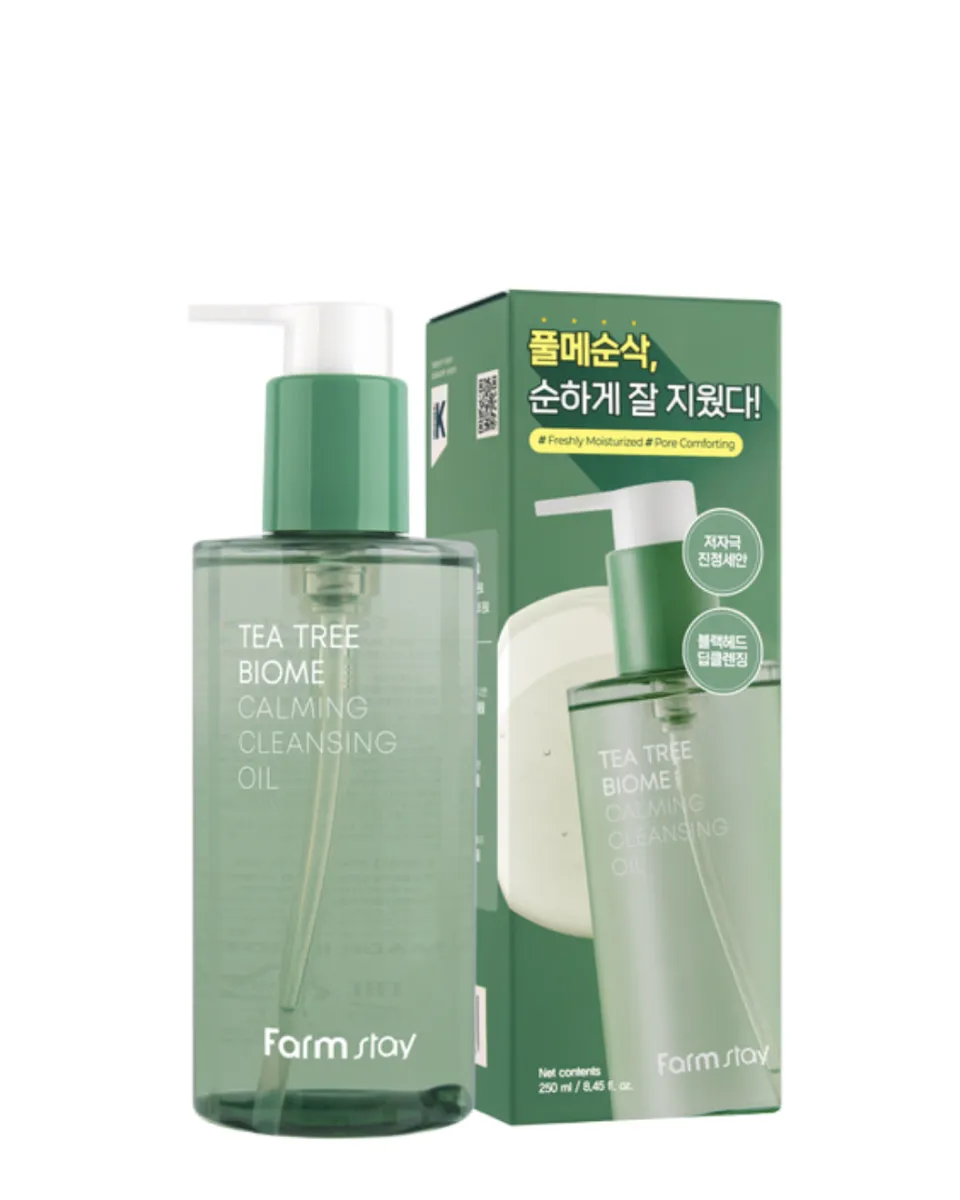 Гидрофильное масло FarmStay Tea Tree Biome Calming Cleansing Oil на основе чайного дерева бережно и тщательно удаляет даже стойкий макияж, выводит загрязнения из пор и устраняет жирный блеск, сухость, раздражение, покраснения и стянутость, смягчает кожу. Гидрофильное масло глубоко проникает в поры, растворяя сальные пробки и устраняя все загрязнения. При постоянном применении устраняет черные точки и снижает риск появления воспалений и закрытых комедонов.