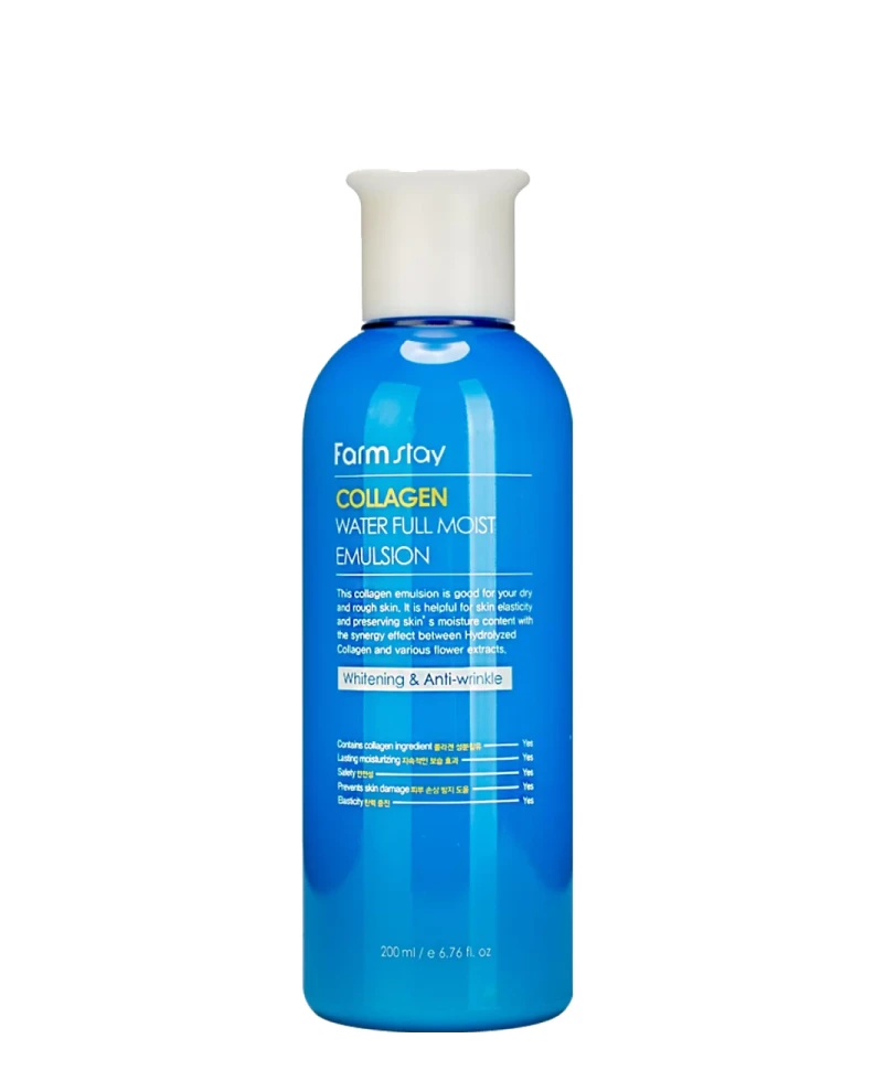 Увлажняющая эмульсия FarmStay Collagen Water Full Moist Emulsion на основе коллагена оказывает интенсивное увлажняющее действие, повышает эластичность кожи, её действие направлено на выравнивание тона кожи и разглаживание морщин. Средство защищает кожу от негативного воздействия внешних факторов, делает кожу менее восприимчивой к раздражающим её погодным условиям. Эмульсия быстро впитывается и обеспечивает длительное увлажнение кожи, устраняет сухость и раздражение, улучшает цвет и текстуру кожи, освежает, повышает упругость, плотность кожи, разглаживает мелкие морщинки, образованные в следствие сухости кожи, омолаживает и замедляет проявление возрастных изменений. Средство придает естественное сияние, успокаивает и оказывает антиоксидантный эффект.