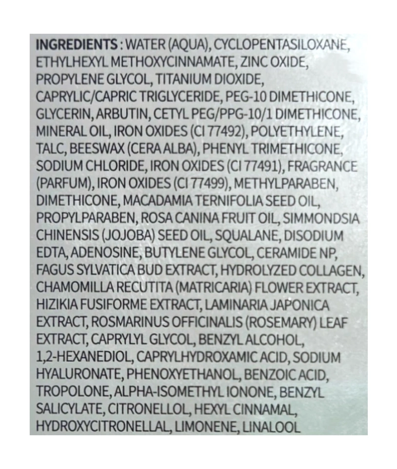 Water (Aqua), Cyclopentasiloxane, Ethylhexyl Methoxycinnamate, Zinc Oxide, Propylene Glycol, Titanium Dioxide (CI 77891), Caprylic/Capric Triglyceride, PEG-10 Dimethicone, Iron Oxides (CI 77492), Glycerin , Cetyl PEG/PPG-10/1 Dimethicone, Arbutin, Mineral Oil, Polyethylene, Talc, Phenyl Trimethicone, Beeswax (Cera Alba), Sodium Chloride, Iron Oxides (CI 77491), Methylparaben, Iron Oxides (CI 77499), Dimethicone, Propylparaben, Rosa Canina Fruit Oil, Squalane, Macadamia Ternifolia Seed Oil, Simmondsia Chinensis (Jojoba) Seed Oil, Disodium EDTA, Adenosine, Butylene Glycol, Ceramide NP, Fagus Sylvatica Bud Extract, Hydrolyzed Collagen, Chamomilla Recutita (Matricaria) Flower Extract, Hizikia Fusiforme Extract, Laminaria Japonica Extract, Rosmarinus Officinalis (Rosemary) Leaf Extract, Caprylyl Glycol, Benzyl Alcohol, 1,2-Hexanediol, Caprylhydroxamic Acid, Sodium Hyaluronate, Phenoxyethanol, Benzoic Acid, Tropolone, Fragrance (Parfum), Alpha-Isomethyl Ionone, Benzyl Salicylate, Citronellol, Limonene, Hexyl Cinnamal, Hydroxycitronellal, Linalool.