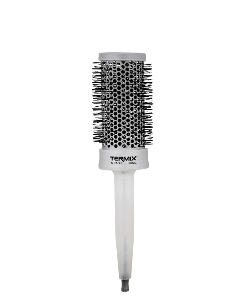 Peria rotundă Termix Professional C-Ramic Ionic Hair Brush cu diametru 43 mm în tambur ceramic și peri ionizați pentru crearea coafurilor fără deteriorarea părului și fără efect de electrizare. Tehnologia ceramică asigură încălzirea uniformă, iar perii ionizați generează ioni negativi la încălzire și reduc electricitatea statică, netezind stratul exterior al firului de păr (cuticula), conferind părului strălucire și netezime, făcându-l mai ascultător.