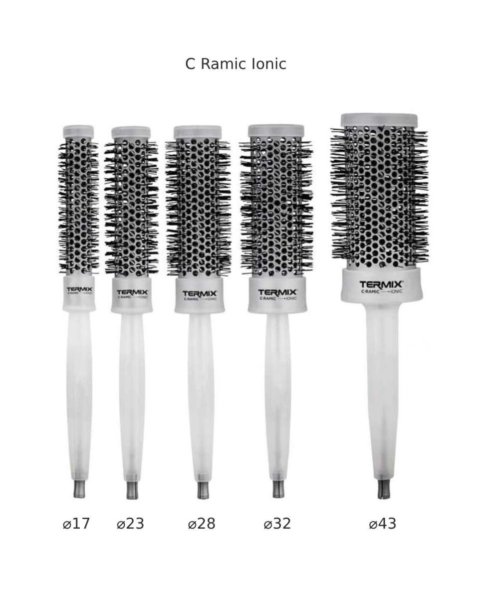 Peria rotundă Termix Professional C-Ramic Ionic Hair Brush cu diametru 17 mm în tambur ceramic și peri ionizați pentru crearea coafurilor fără deteriorarea părului și fără efect de electrizare. Tehnologia ceramică asigură încălzirea uniformă, iar perii ionizați generează ioni negativi la încălzire și reduc electricitatea statică, netezind stratul exterior al firului de păr (cuticula), conferind părului strălucire și netezime, făcându-l mai ascultător.
