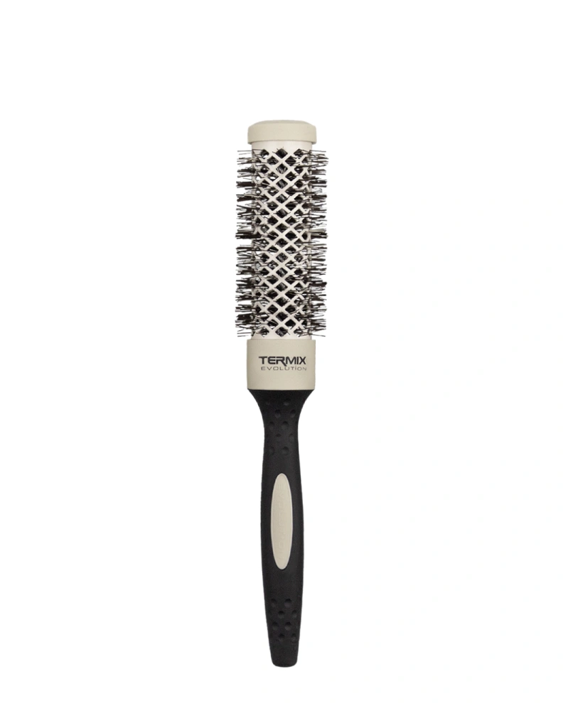 Peria rotundă Termix Evolution Soft Hair Brush cu diametru 28 mm în tambur ceramic și peri ionizați pentru crearea coafurilor fără deteriorarea părului și fără efect de electrizare. Se distinge prin perforația inovatoare în formă de romb, care mărește fluxul de aer cu 10% și reduce timpul de uscare cu 30%.