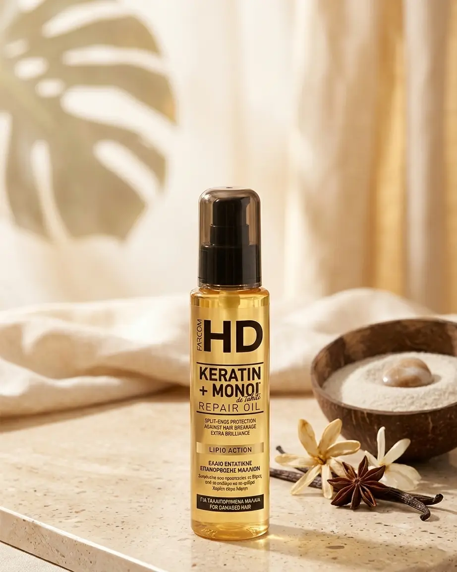 - Farcom HD Repair Oil Keratin + Monoi de Tahiti: восстанавливает повреждённую структуру волос и добавляет дополнительное сияние окрашенному оттенку.